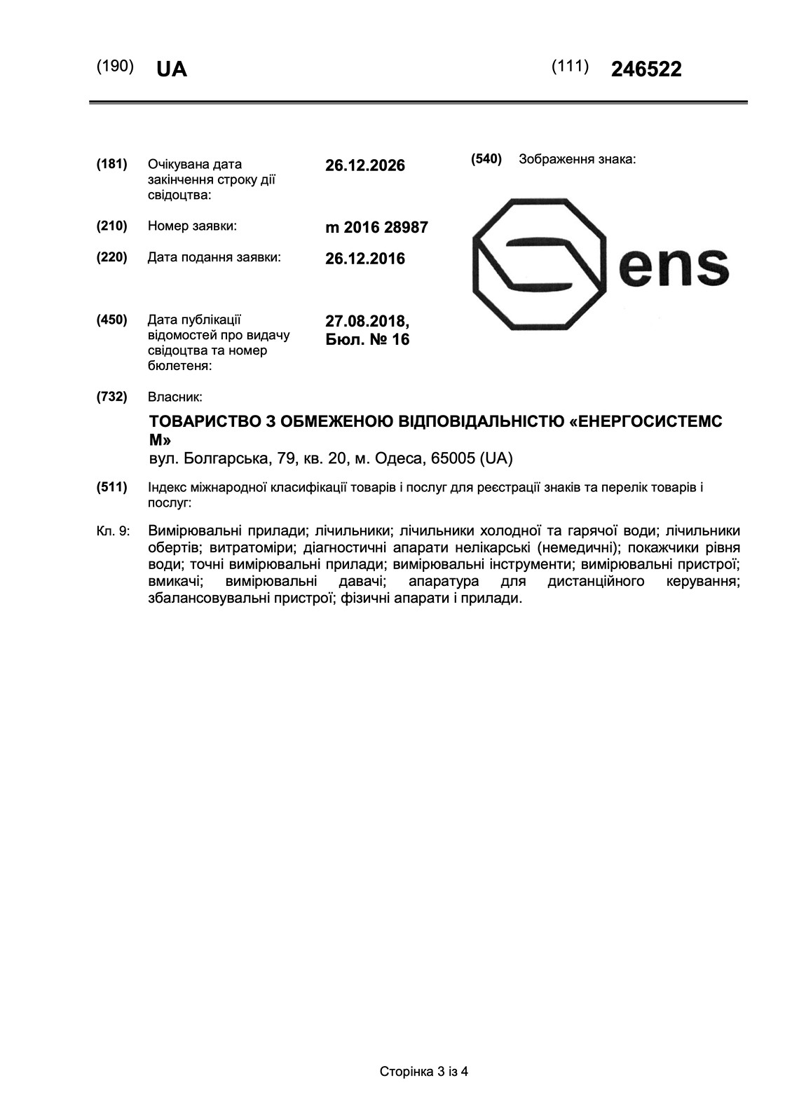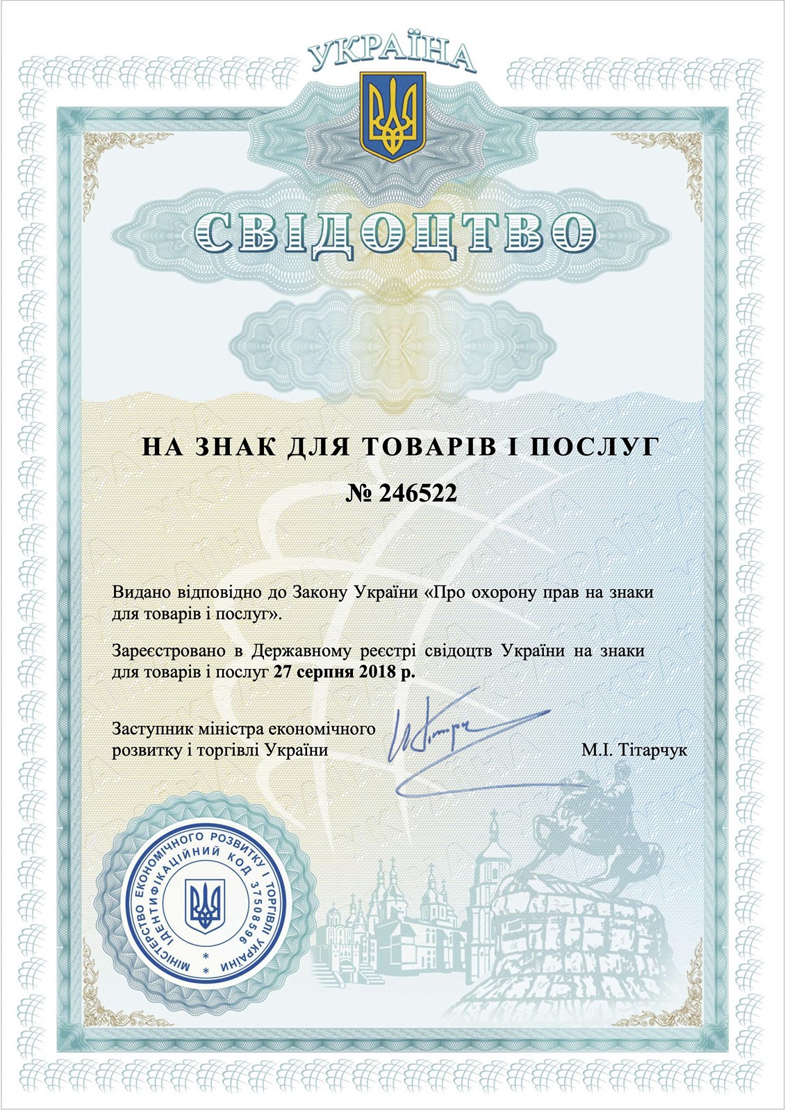 СВІДОЦТВО НА ЗНАК ДЛЯ ТОВАРІВ І ПОСЛУГ № 246522