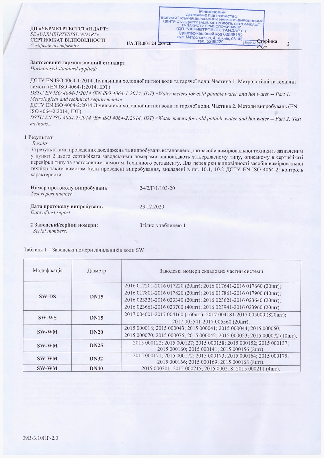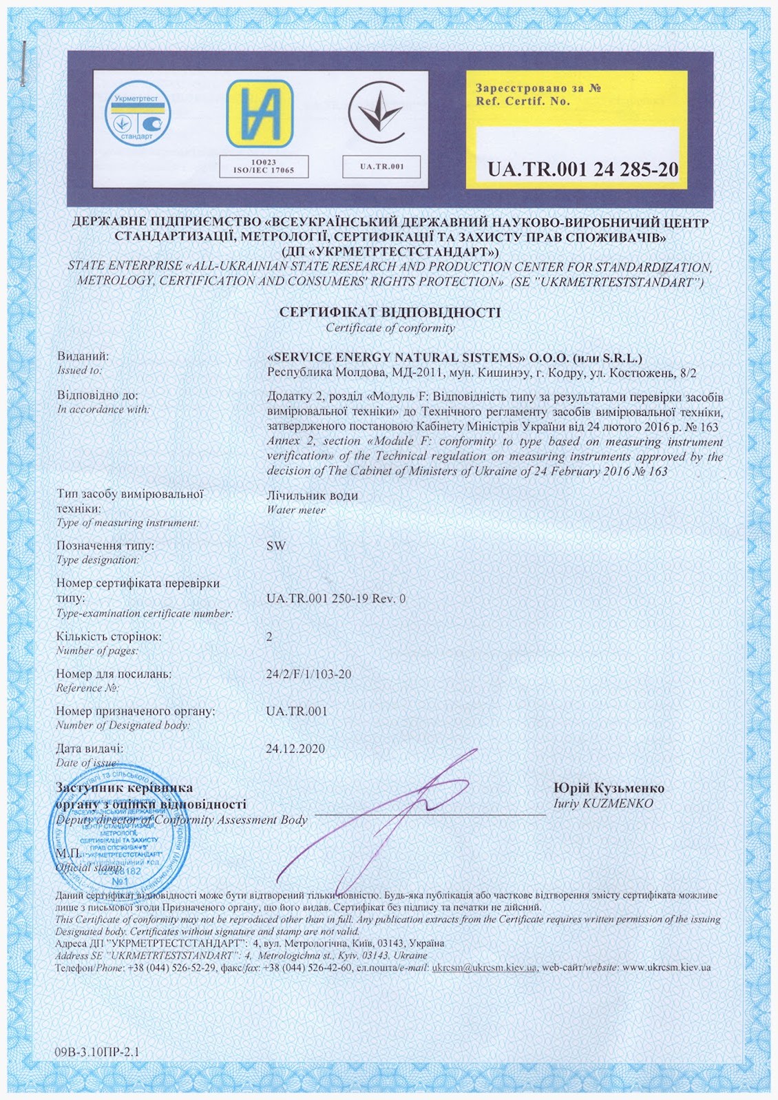 СЕРТИФІКАТ ВІДПОВІДНОСТІ: UA.TR.001 24 285-20